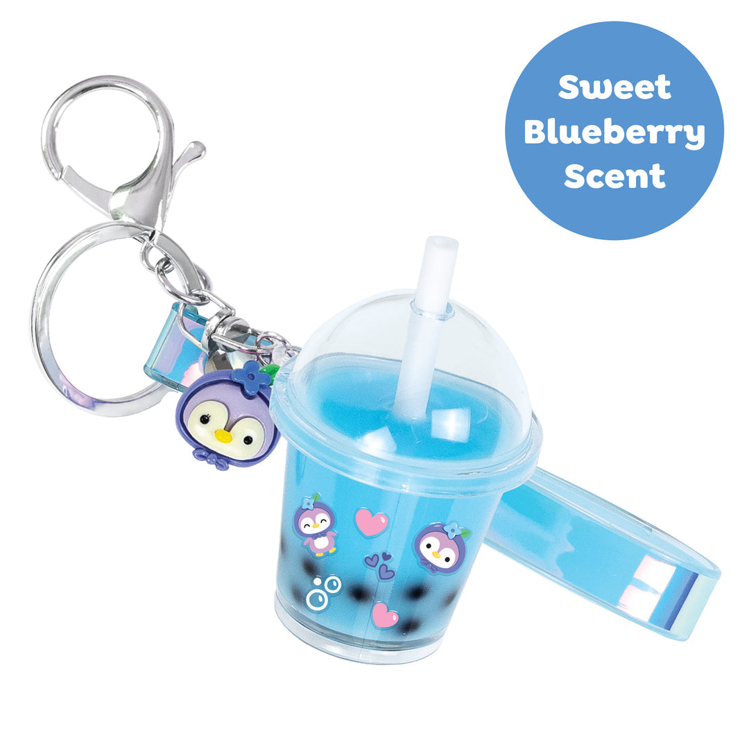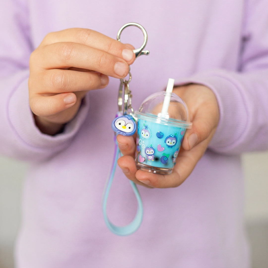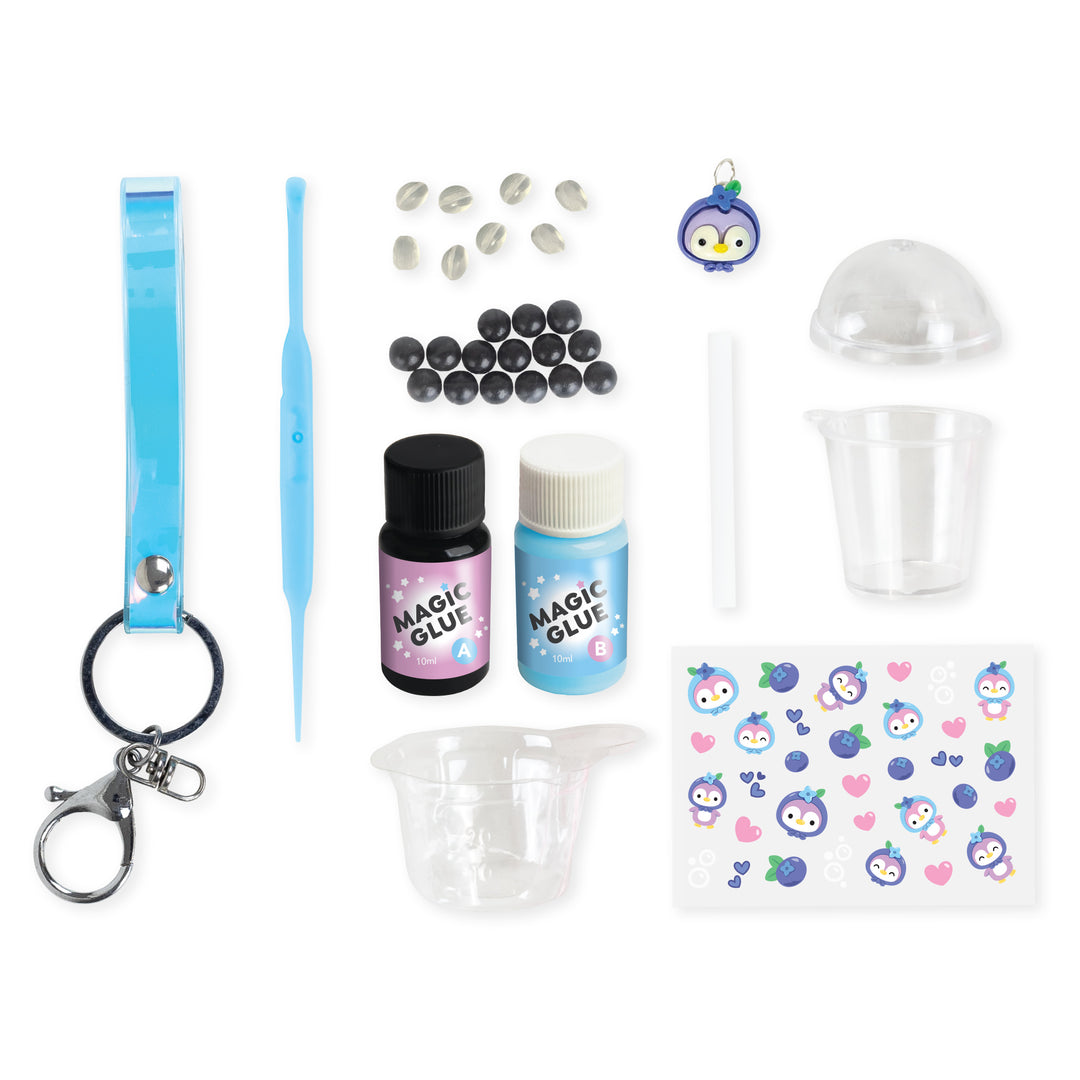 • Each set includes: 1 mini bubble tea cup and lid, iridescent blue vinyl hand strap w/key ring hardware, 1 mini sticker sheet, 1 mini straw, 1 blueberry penguin charm, mini black and scented clear ‘boba’ balls, mixing tool, mixing dish, blue & clear Magic Glue compound
