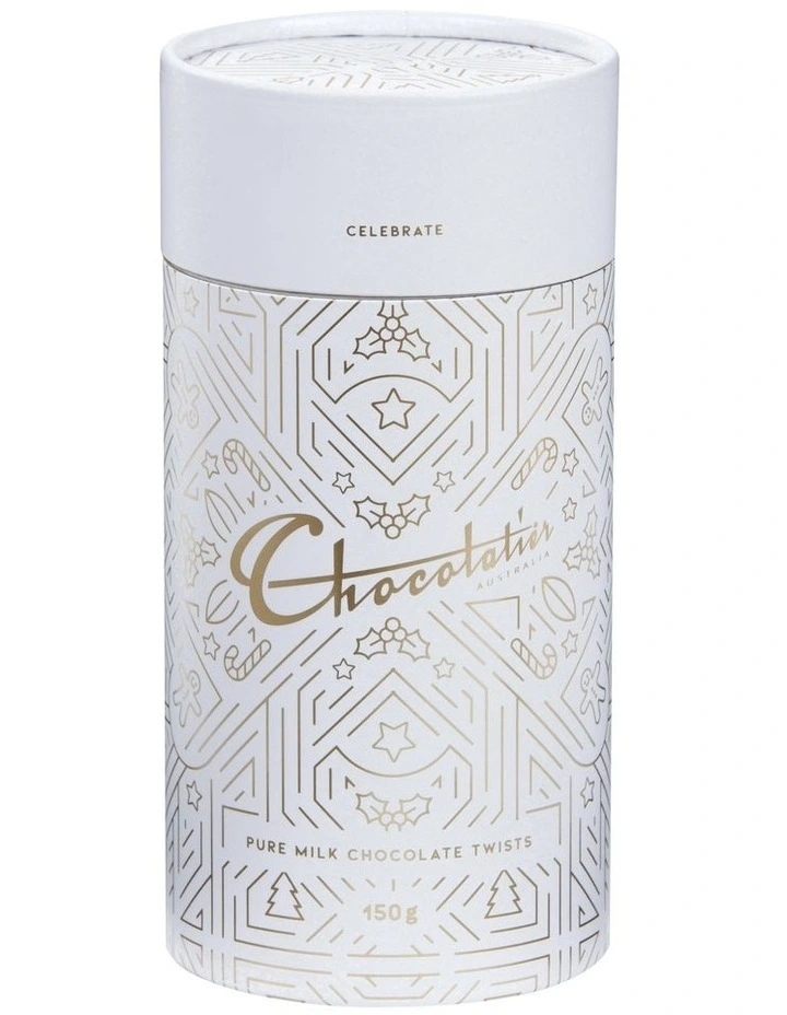 Chocolatier Gift Canister filled with Pure Milk Chocolate Twists 150g.