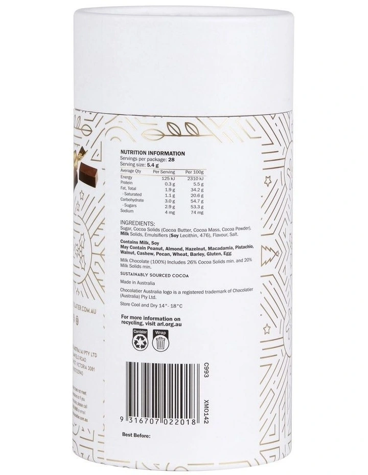 Individually wrapped pure smooth milk chocolate bars wrapped in a gold foil, beautifully presented in a white and gold gift canister.