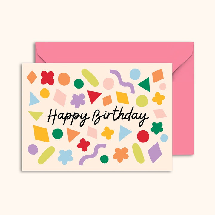 Hand holding a colorful greeting card with festive illustrations and 'Merry and Bright' text.