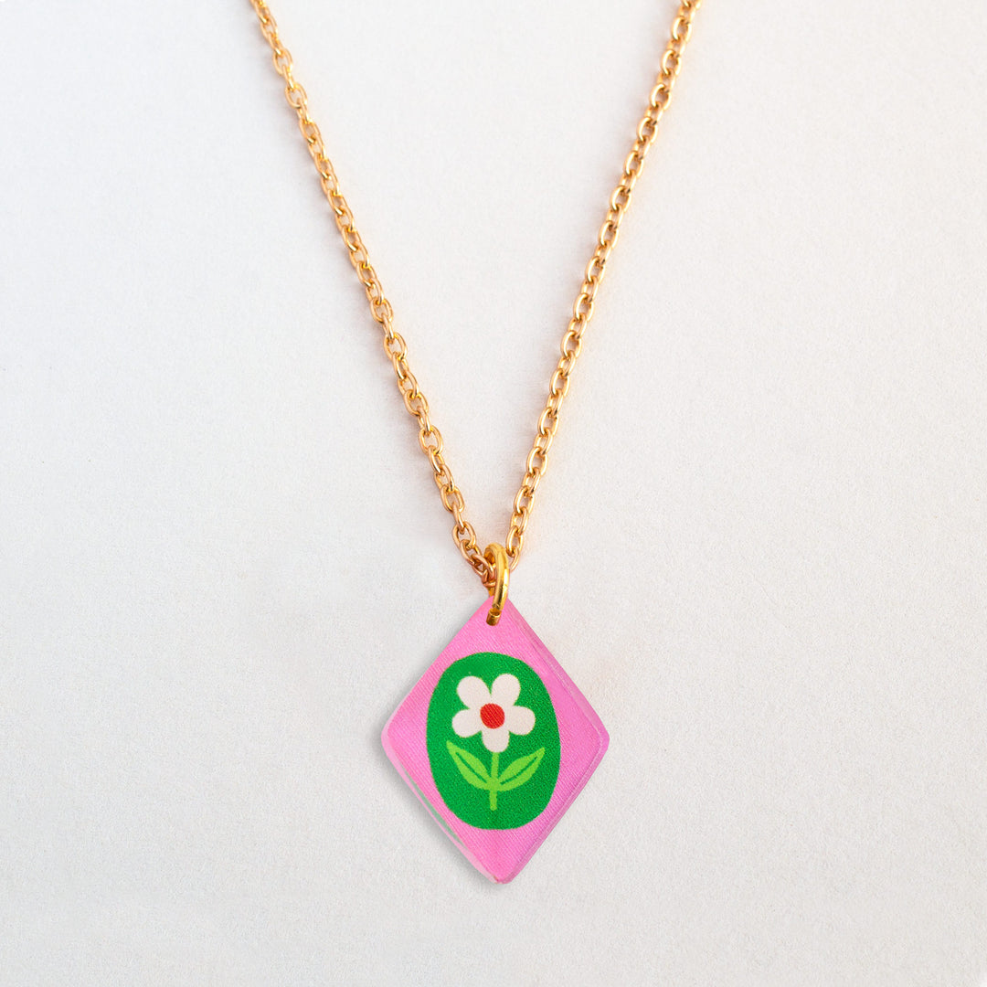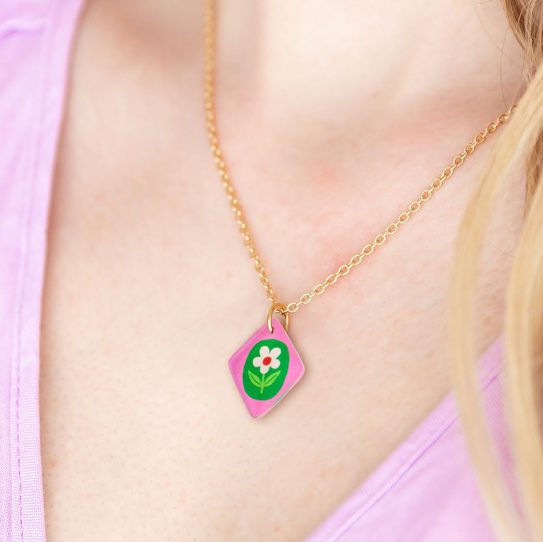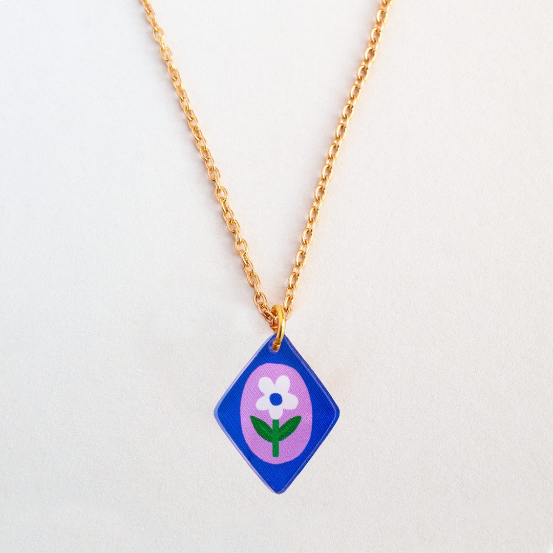 Floral charm pendant necklace in blue, pink and lilac colour options. Add a joyful pop of colour to everyday outfits with these colourful floral charm pendant necklaces. Featuring a hand-illustrated flower motif on a bold background colour, each necklace is finished with a delicate gold-plated chain and is available in three vibrant colour options. Lightweight, eye-catching and easy to wear, these illustrated charm necklaces are perfect for elevating daily style or layering with other jewellery.