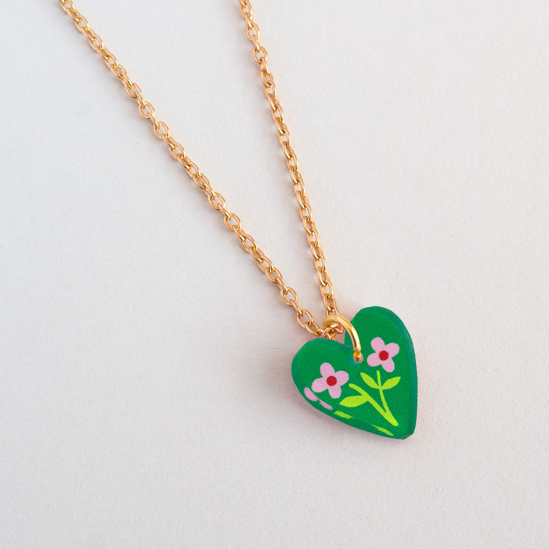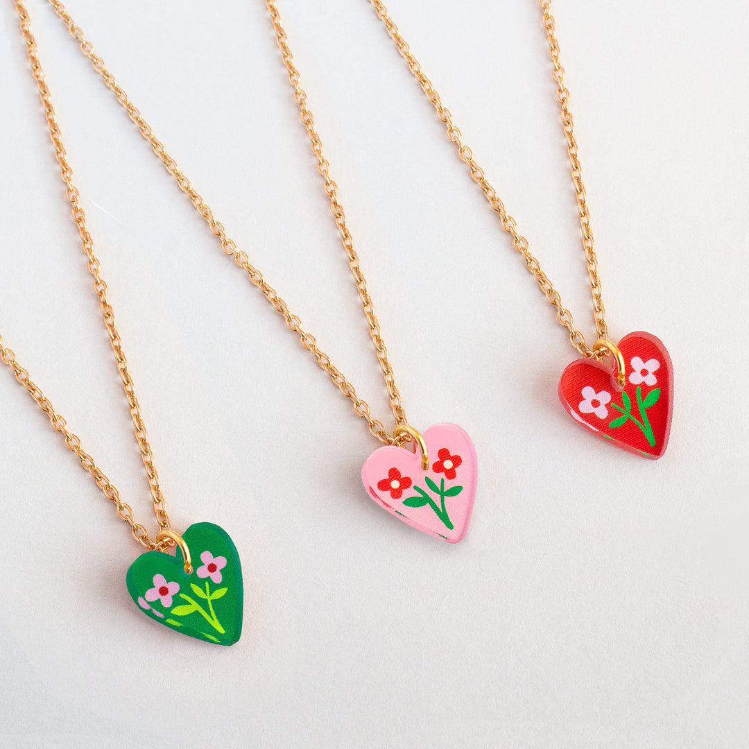 Heart charm necklace in green, red and pink colour options. Add a playful pop of colour to everyday outfits with these mini heart charm pendant necklaces, featuring an illustrated floral heart charm suspended from a delicate gold-plated chain. Sweet, lightweight and easy to wear, these colourful heart necklaces are perfect for elevating daily style or layering with other jewellery. Available in three vibrant colour options, they make a thoughtful and giftable accessory for any occasion.