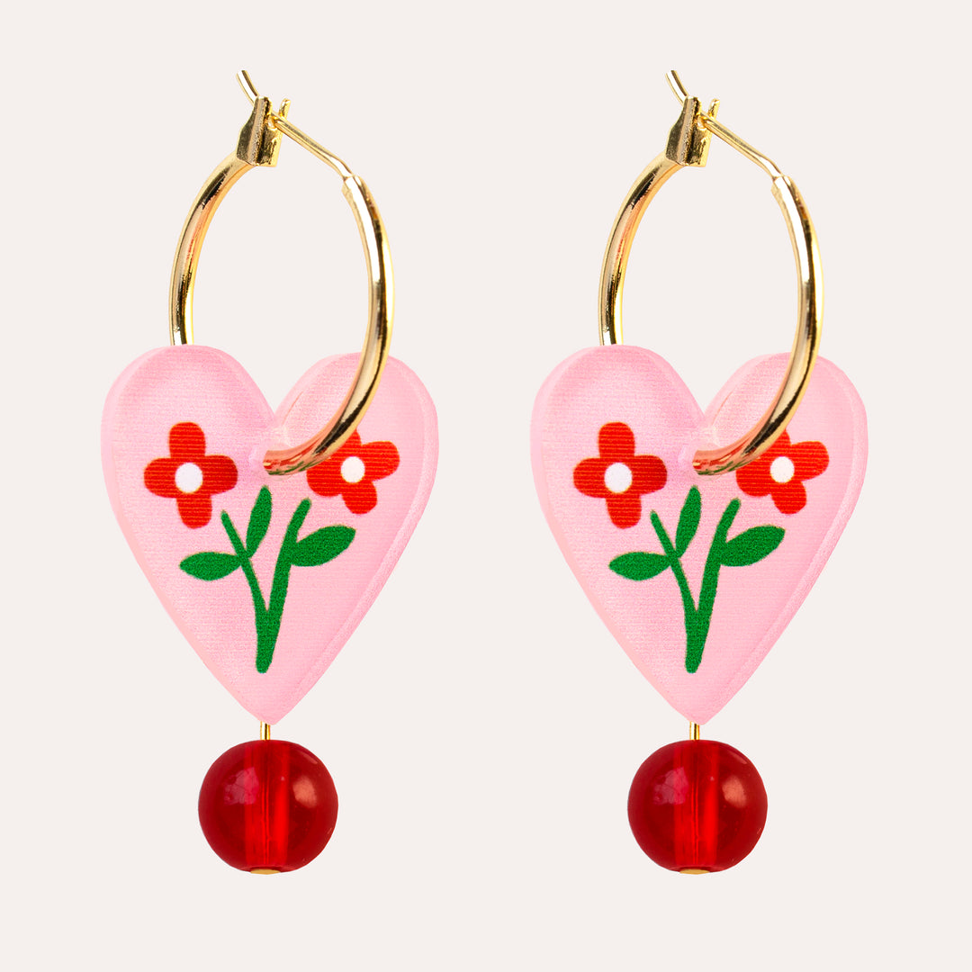Heart Hoop Statement Earrings. Add a joyful pop of colour to everyday outfits with these heart charm hoop earrings, featuring an illustrated floral heart charm finished with a sweet glass bead that gently sways as you move. Bold, playful and full of personality, these heart earrings make the perfect thoughtful jewellery gift for her.