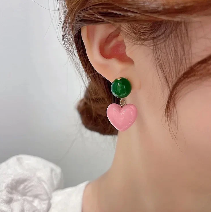 Stunning heart statement earrings, in glorious green and pretty pink.