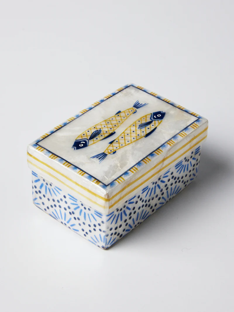 This sweet box is handcrafted from luminous capiz shells, giving it an iridescent, shimmery finish that catches the light. The lid features an original painting of two tropical fish swimming side-by-side, their scales and fins rendered in intricate detail through vibrant brushstrokes of blue and yellow. Bold patterns in blue shades adorn the sides, evoking the movement of ocean waves. Perfect for displaying treasured keepsakes or stashing away small treasures, this artisan-made box adds a burst of tropical vibes wherever you place it. With its natural materials and hand-painted designs, the Atlantic Fish Pair Box captures the laid-back spirit of seaside living.