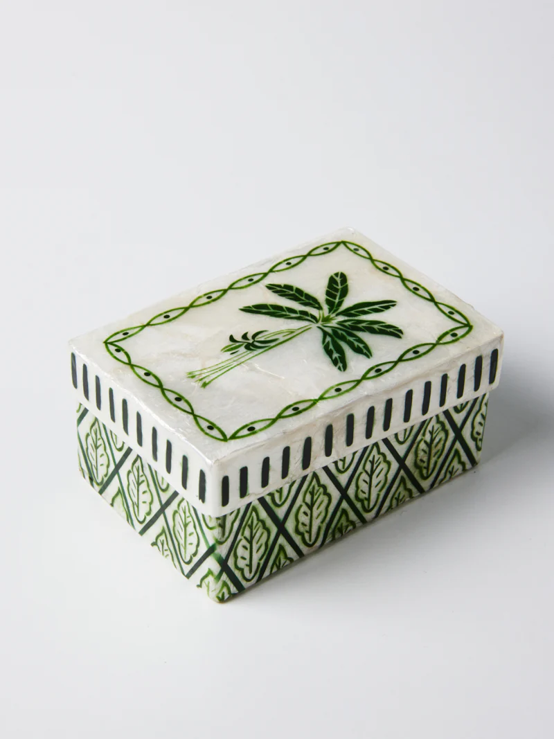 Bring the lush beauty of the tropics into your home with the Atlantic Green Palm Box. This rectangle box is handcrafted from shimmering capiz shells, giving it an iridescent, luminous finish. The lid features an original painting of a lush green palm tree, its fronds sweeping across in intricate brushstrokes that capture every detail. Geometric patterns in greens adorn the sides, evoking the relaxing hues of island waters. Perfect for stashing away small items like jewellery, with its natural materials and hand-painted designs, the Atlantic Green Palm Box transports you to your own tropical paradise. Embrace the laid-back spirit of island living with this vibrant, statement-making accent piece.