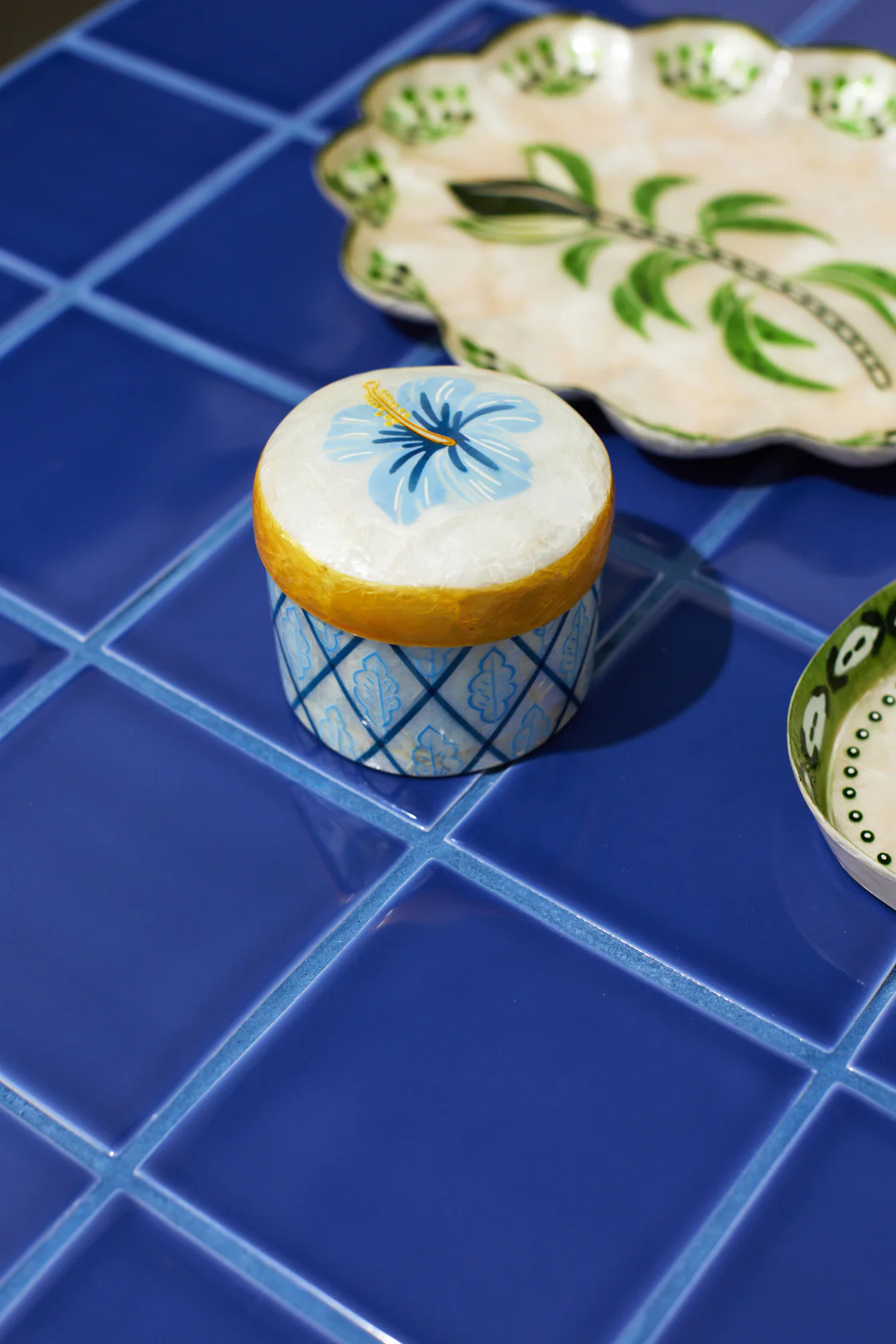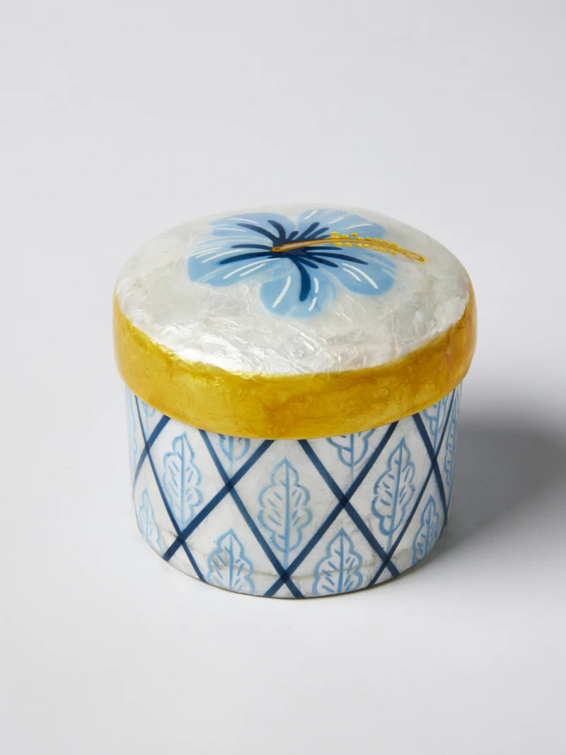 Embrace tropical paradise with the Atlantic Hibiscus Box. This round box is handcrafted from capiz shells, giving it an iridescent, shimmery finish. The lid features an original painting of a blue hibiscus bloom, its delicate petals brought to life with intricate brushstrokes. Surrounding the flower, motifs in vivid blues swirl across the sides. Perfect for stashing away small items, this artisan-made box adds a burst of island-inspired charm wherever you place it. With its natural materials and hand-painted designs, the Atlantic Hibisc