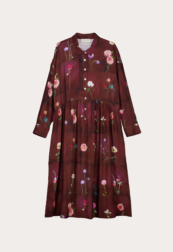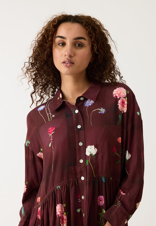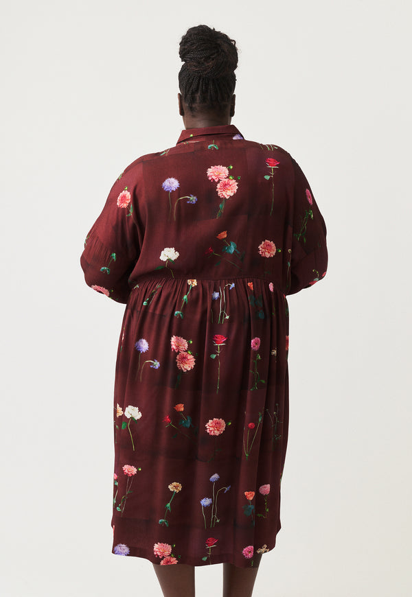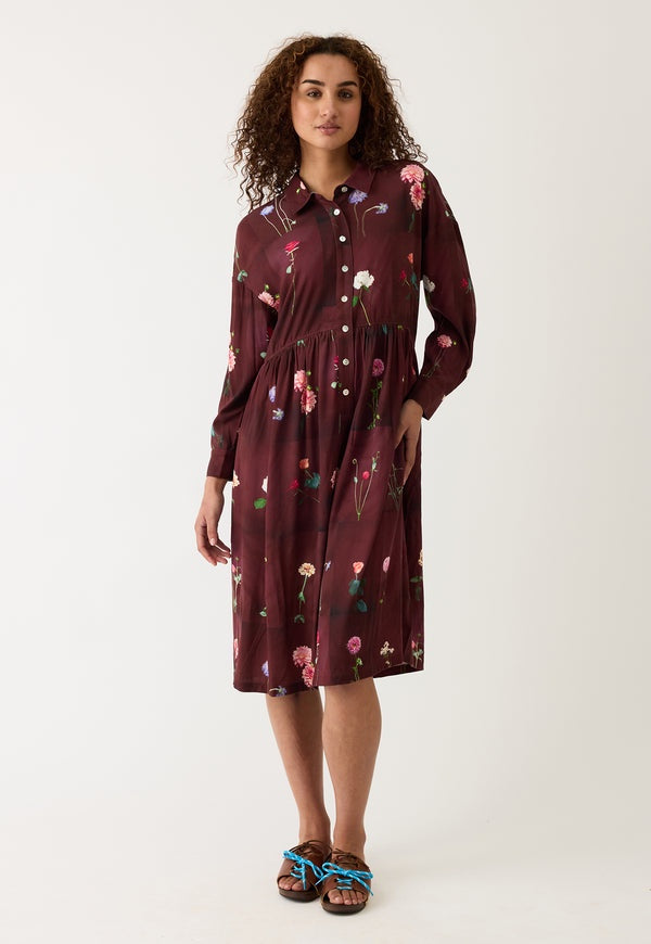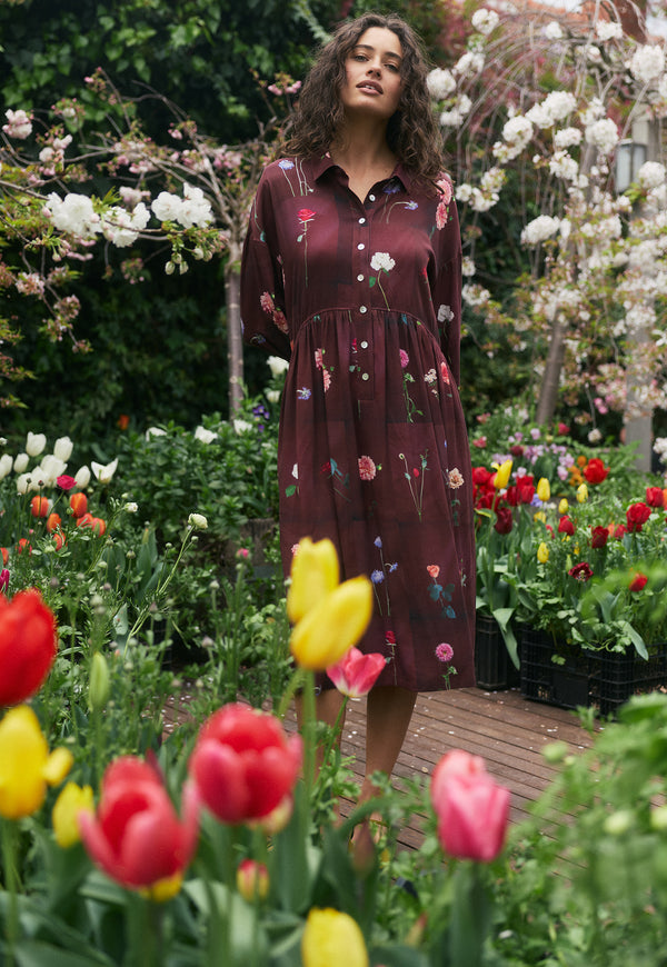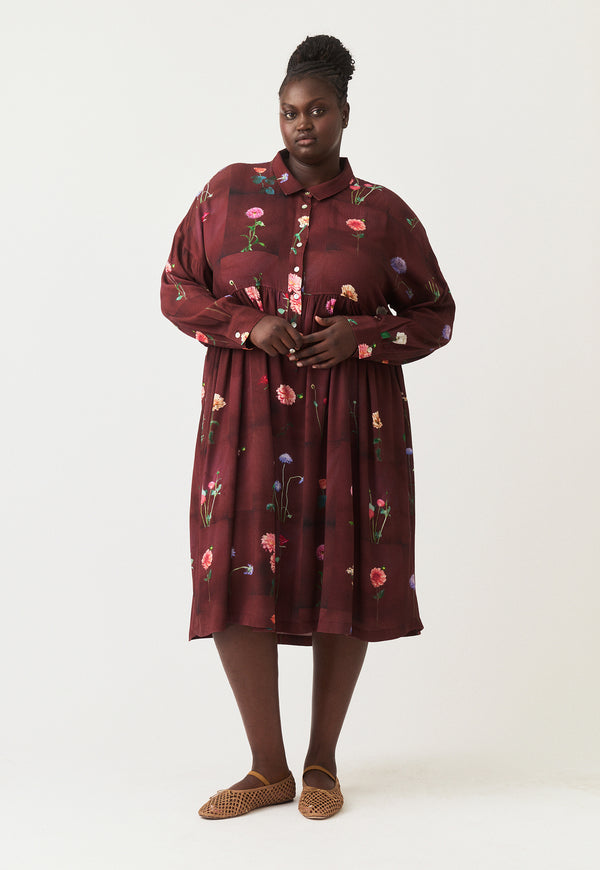 The Alla Dress with its relaxed shirt fit and midi length in drapey Lenzing Tencel Viscose fabric is perfect for a winter layering look.