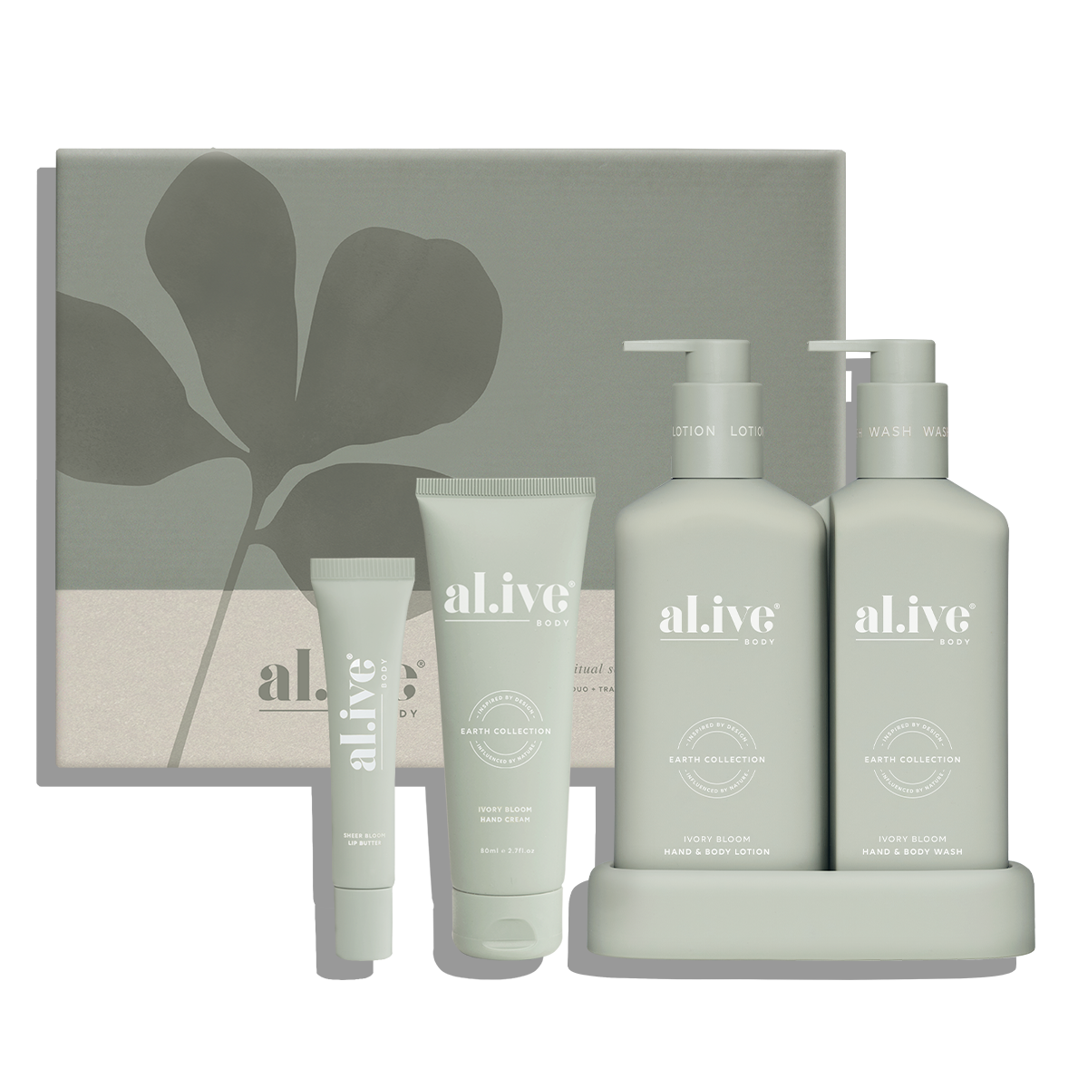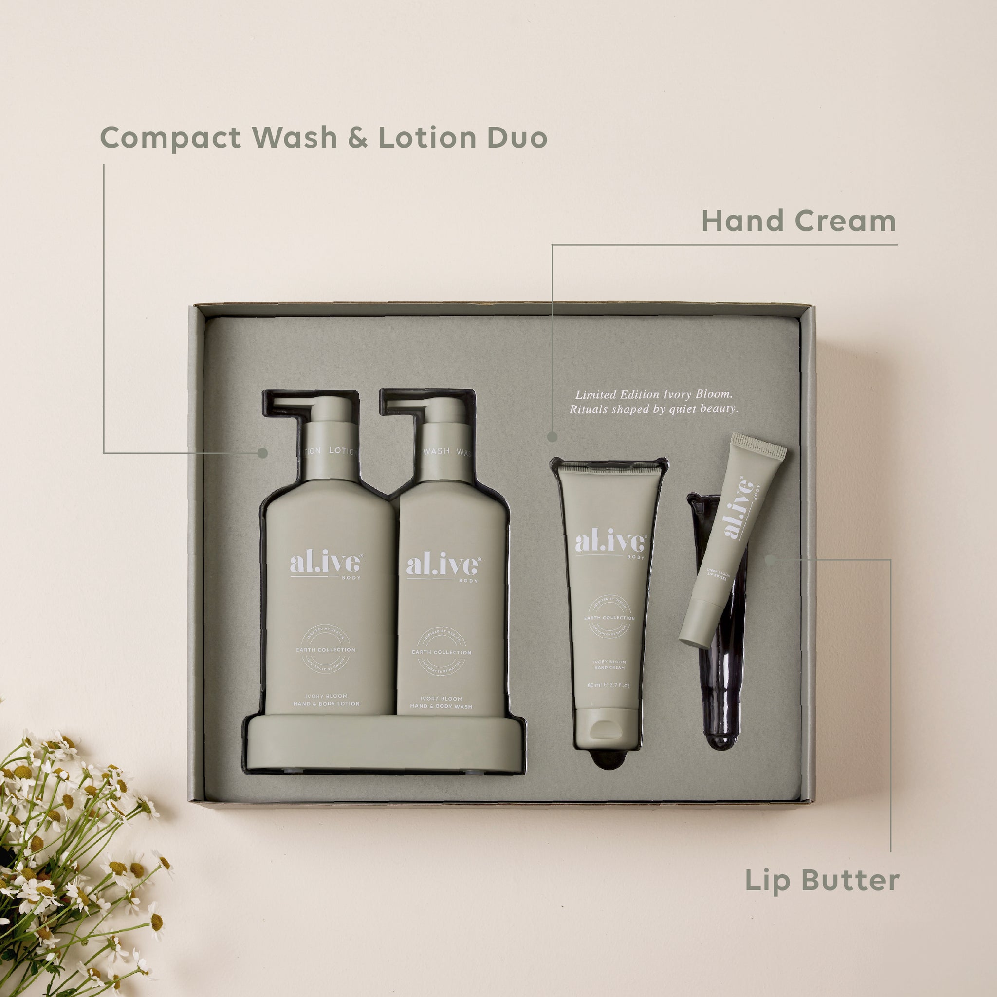 A Body Ritual Gift Set featuring our Compact Bathroom Duo with a 300ml Hand & Body Wash and 300ml Hand & Body Lotion, an 80ml Hand Cream and a 15ml Sheer Bloom Lip Butter. Scented with the limited edition Ivory Bloom fragrance, inspired by soft white florals, it’s designed to create a calming daily body care routine.