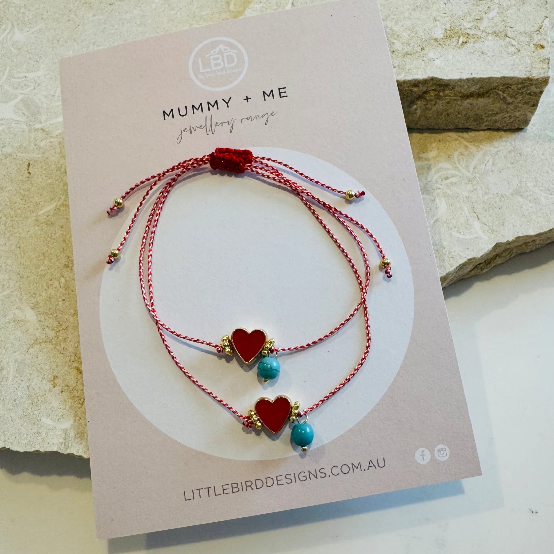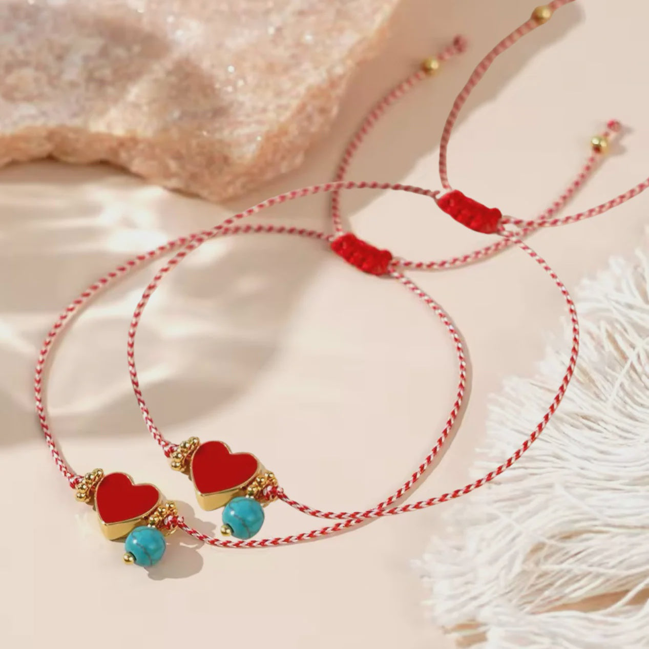 Stunning matching adjustable red and white braided bracelets with shiny gold accents, red enamel heart and turquoise bead.