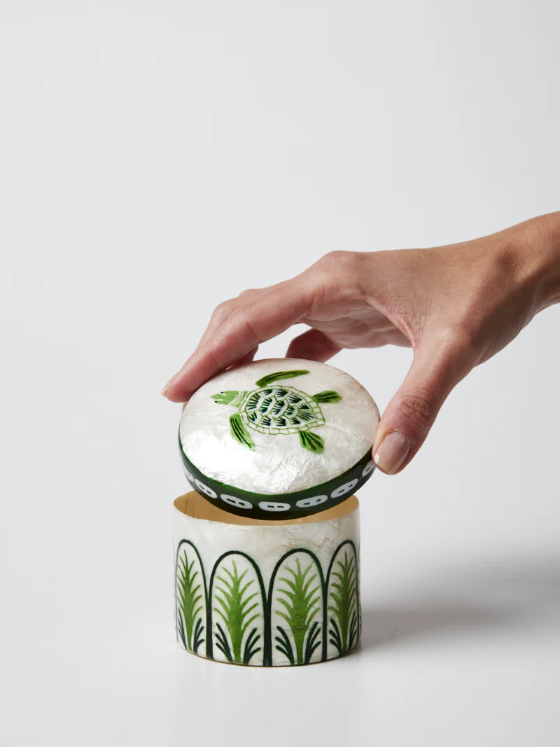 Bring a touch of the sea into your home with the Atlantic Turtle Box. This sweet round box is handcrafted from iridescent capiz shells, giving it a shimmery finish. The lid features an original painting of a green sea turtle, art deco patterns in rich greens dance across the sides, perfect for displaying coastal keepsakes or stashing away small treasures, this one-of-a-kind box adds artisan-made charm and tropical vibes wherever you place it.