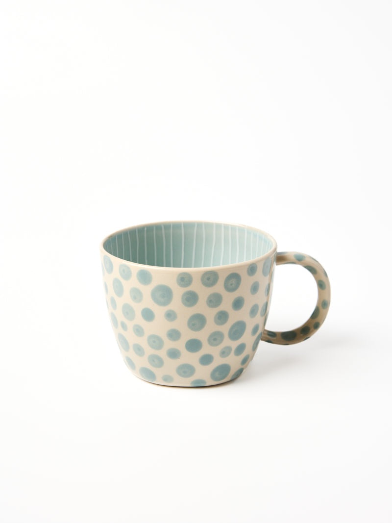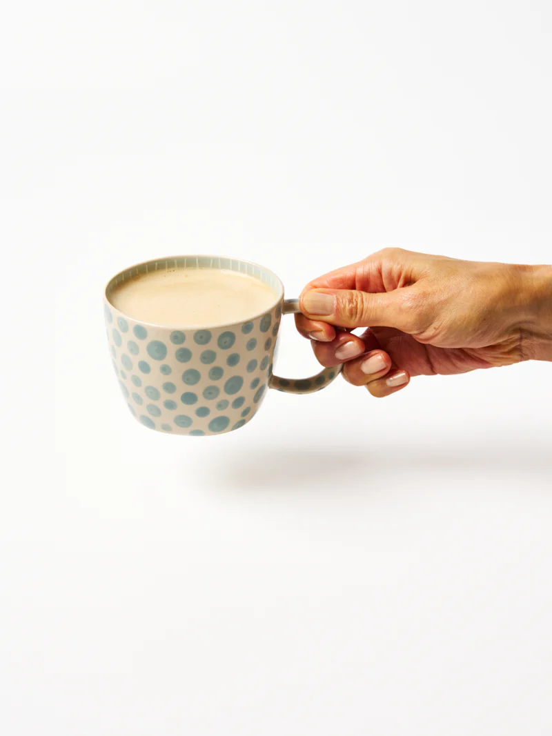 The Chino Mug Powder Dot pairs a soft blue base with hand-painted polka dots for a timeless yet modern feel. Crafted from fine earthenware, it's lightweight with a thin ceramic lip that coffee and tea lovers adore. The ergonomic handle makes sipping effortless, while its stackable design adds convenience. A bestselling ceramic mug for daily use, now in a fresh new palette.