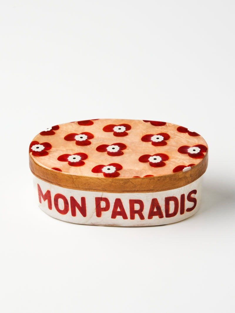 Blush tones and fun florals transform this Capiz shell box into both functional storage and decorative statement. Hand-crafted by skilled artisans following Sydney designs, each piece harnesses the natural luminosity of the shell while adding fun sophistication to bedside tables and vanities. The generous proportions create ample space for jewellery, keepsakes, and treasures and is inscribed with the phrase "Mon Paradis" which means 'my paradise'.