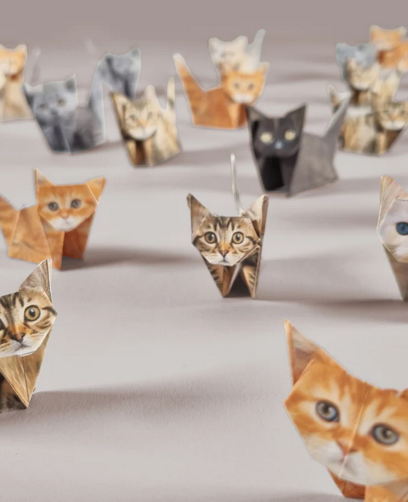 Fold the eco-friendly printed origami paper into life-like cats and kittens of different breeds and sizes and scatter them around your home or workspace to bring you joy everyday.