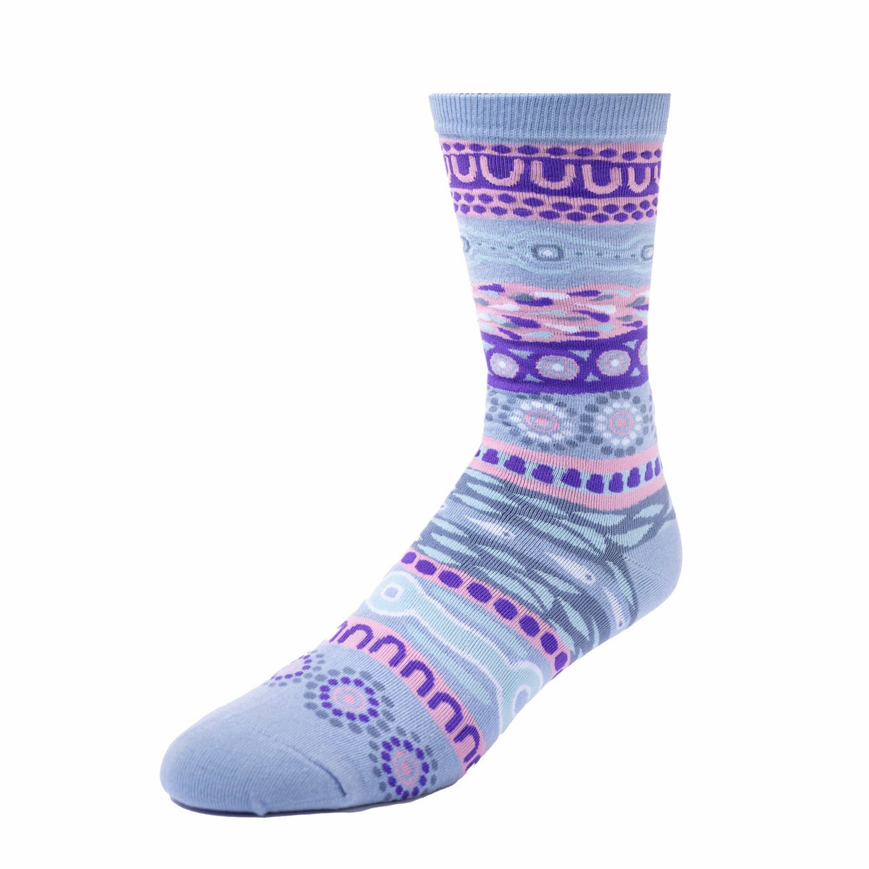 The socks feature an intricate Indigenous dot artwork design. The pattern consists of numerous small circles or dots arranged in flowing, wave-like formations. These dotted lines create a sense of movement and rhythm across the sock. The design appears to be inspired by water or river motifs, with curving patterns reminiscent of flowing streams or ripples. The artwork covers the entire visible surface of the sock, creating a continuous and immersive pattern from top to bottom.
